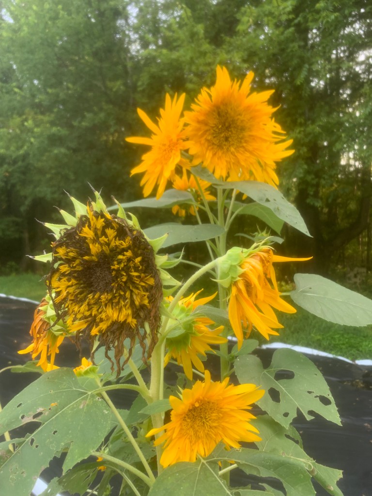 Like our scorched sunflower, some of our plants are expressing their discontent with the rising temps. But, many of our crops are POPPIN’ OFF!