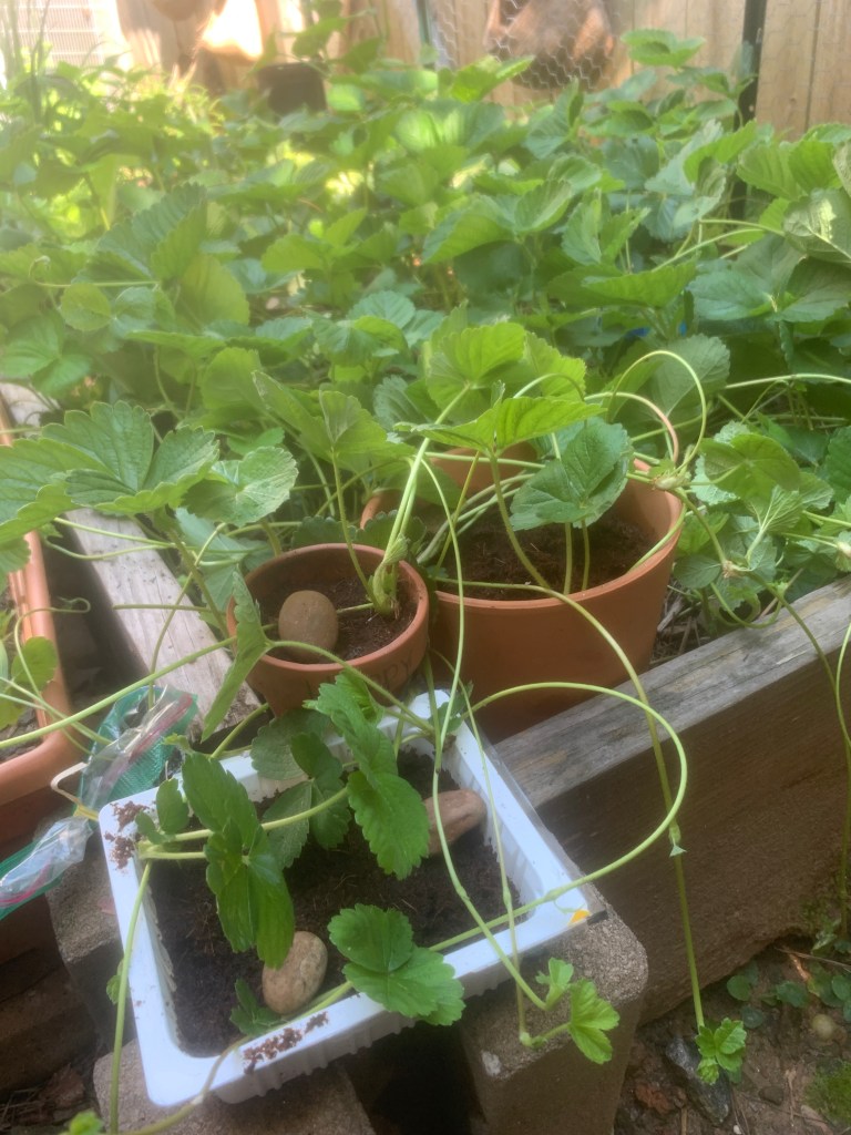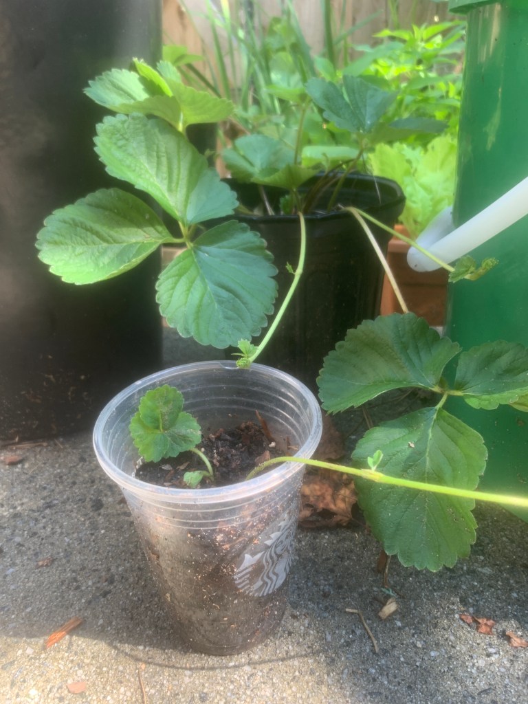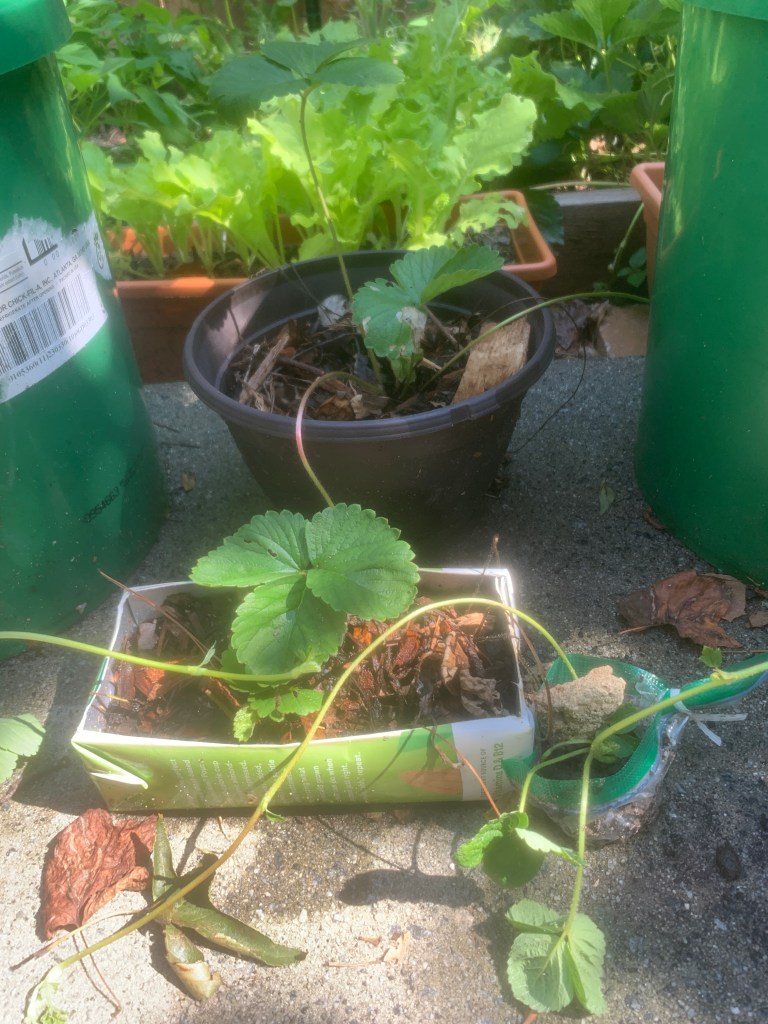 Since that proclamation, I’ve been on a mission to ground any strawberry runners I find to encourage more strawberry plant growth. In doing so, I’ve experienced a constant shortage of growing space. I’ve been growing strawberry plants in empty yogurt tubs, water bottles, tofu containers…and anything else I re-imagine as a temporary pot.