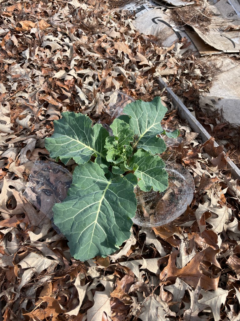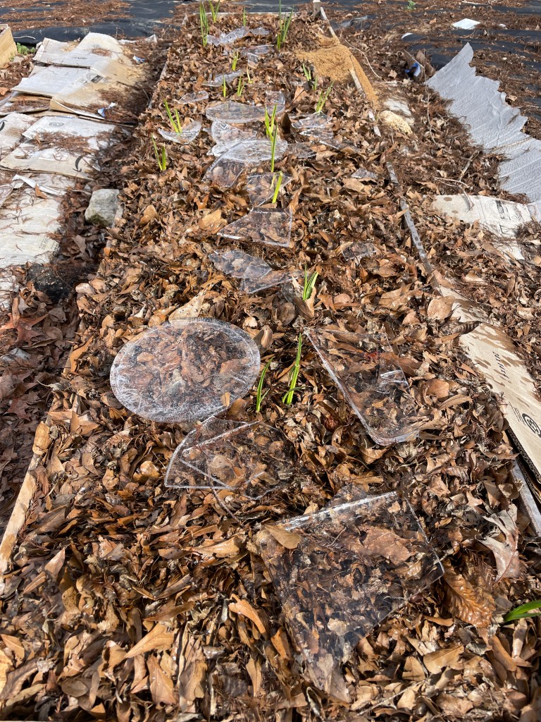 With the temps getting colder each week, I’ve been able to implement a sort of “slow release watering system”. It’s not as fancy or sophisticated as it may sound though. The system involves me randomly scattering empty 5 gallon buckets (sourced for free from local restaurants) around the property to harvest any form of precipitation. In the early mornings, I carefully fish formed ice rounds out of the buckets and place them on our beds. As the sun rises and the day gets warmer, the ice eventually melts into the soil around the plants.