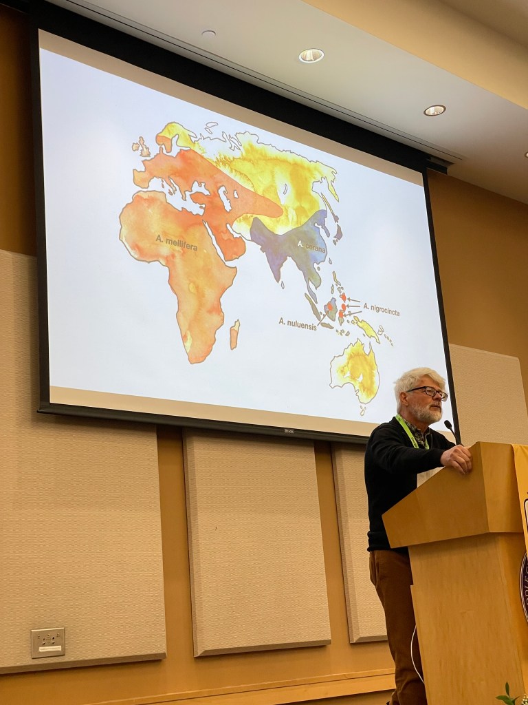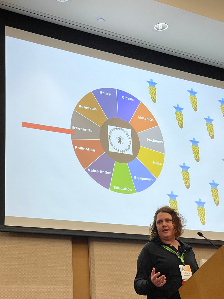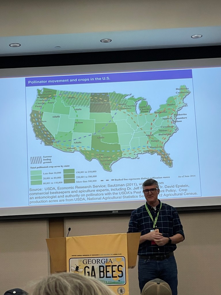 I didn’t read a bee book this month, but I did attend the Georgia Beekeepers Association (GBA) Spring Conference in Macon where I learned a TON. And, guess who was a keynote speaker – Keith Delaplane – professor of entomology at UGA and author of my bee book of choice last month. Dr. Delaplane’s intriguing presentation was titled : “The Geographic Natural History of Honey Bees: How We Got The Races We Use In Beekeeping”. Keynote speaker, Dr. Jamie Ellis from The University of Florida, presented on the science of bee nutrition and what beekeepers can do to improve colony survival rates. Megan Mahoney is a commercial beekeeper operating in Texas and North Dakota and specialized in instrumental insemination, breeder queens, and cell production. Her presentation will forever be remembered for the moment I learned the value of a microliter vial of male bee sperm…$1,200. Wow. I attended breakout sessions on the business of beekeeping and planting for pollinators. The conference presenters generously shared their wealth of knowledge as I feverishly scribbled notes and snapped pics for future reference.
