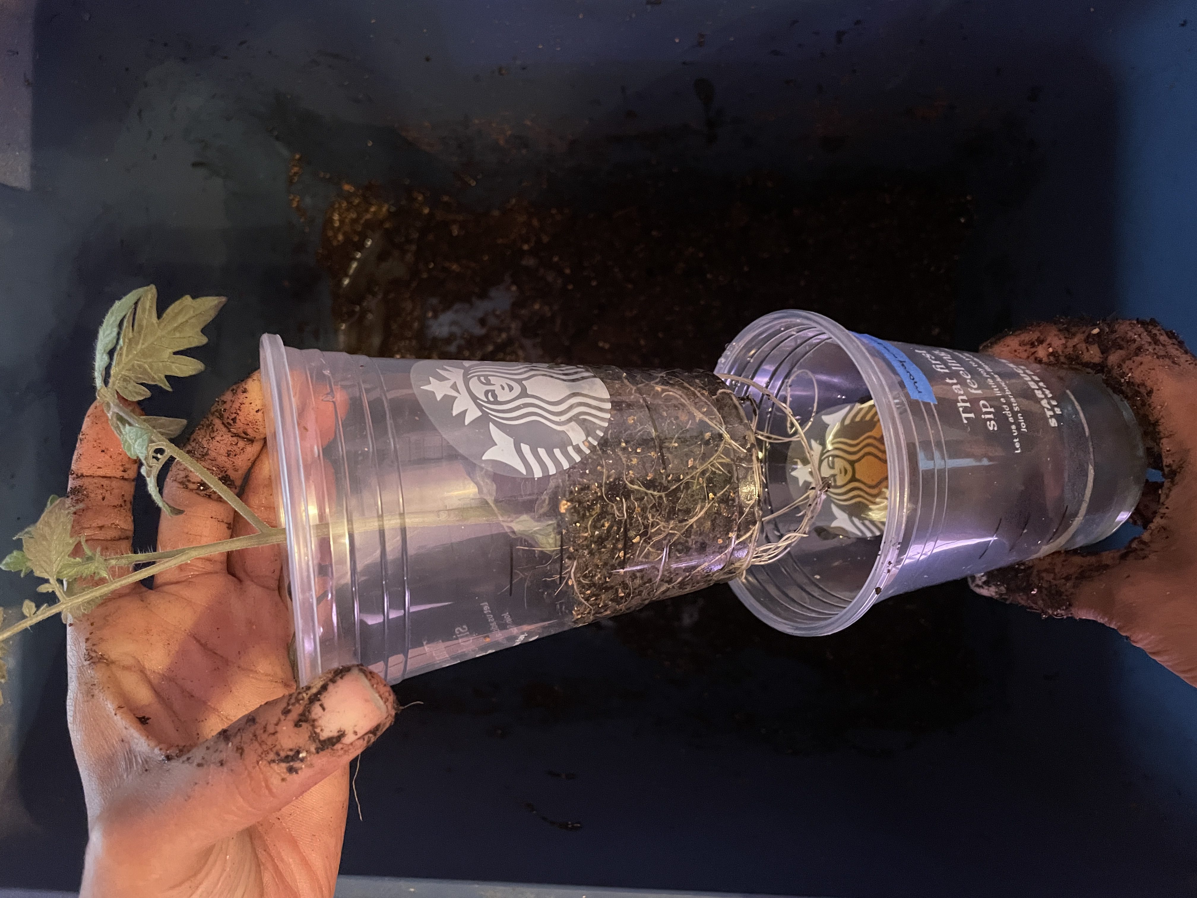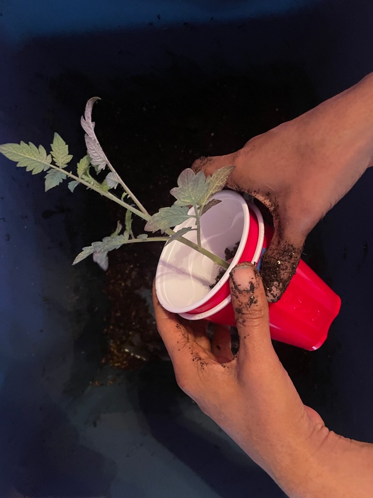 Once the tomato plants grew above the cup rim, I added more soil to fill the cup – burying the plant up to its “neck”. The newly buried stem will develop roots all the way up anywhere it touches soil. This, essentially, creates an additional layer of roots on the plant making it even stronger.
