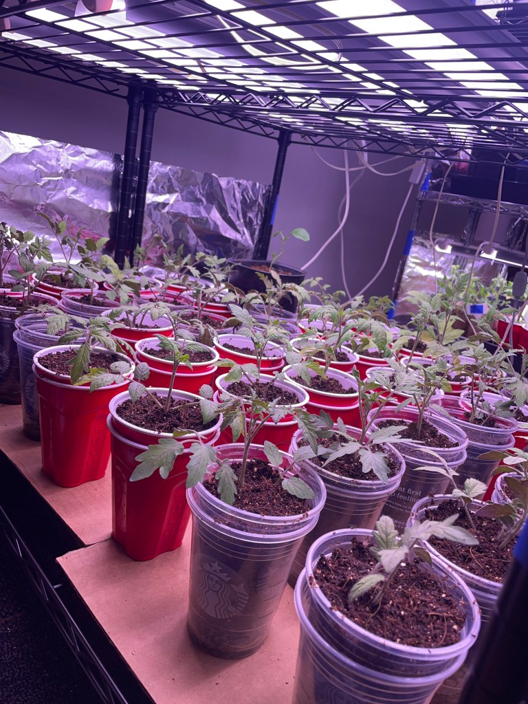 The plants will remain in these cups until they are ready to be transplanted outside (sometime after the last frost expected by the end of this month). They’ll, at least, double in size over the next few weeks and should be plenty strong enough to face the cruel outdoors. When I transplant them outside, I’ll bury them, again, up to their “neck” and allow them to grow another layer of roots – for a total of THREE root system layers. In the meantime, I’ll be working on the farm to build new raised beds with trellis systems for them and their beneficial companion plants. Stay tuned!