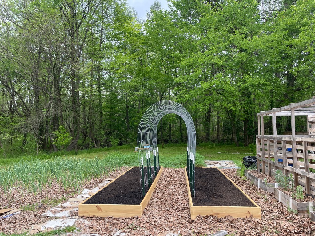 The tomato plants we’ve been growing in our indoor farm (formerly known as our living room) are nearly busting out of their containers and anxious to get outside. Since we’re nearly 10x-ing our tomato production this year, we needed to build some more beds on the farm for them. So, we got busy executing my vision!
