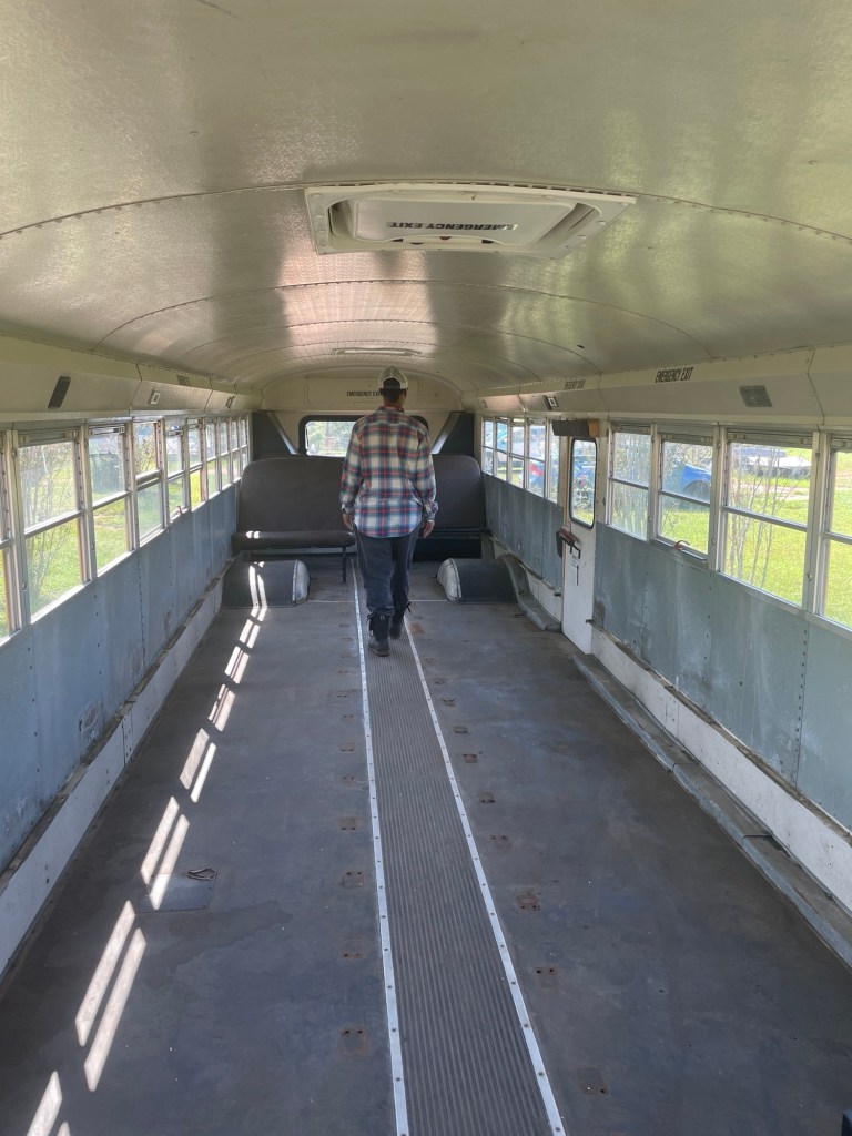 The inside of the bus is an empty shell, but not for long! Stay tuned for the transformation.