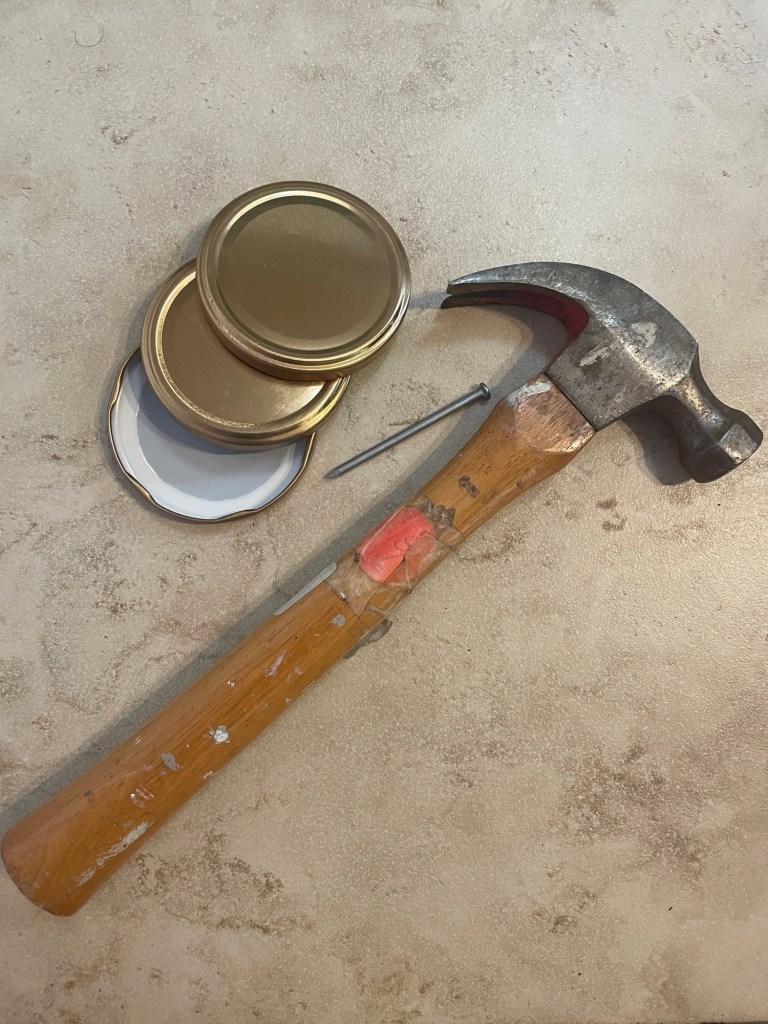 Bees need access to water for cooling, hydration, feeding their babies, and honey production. They prefer a stagnant, shallow water source with something for them to land on to prevent drowning. I sourced old pickle jars and small rocks, bought replacement jar lids, and acquired secondhand dish plates to create watering stations for the bees (and other small pollinators).