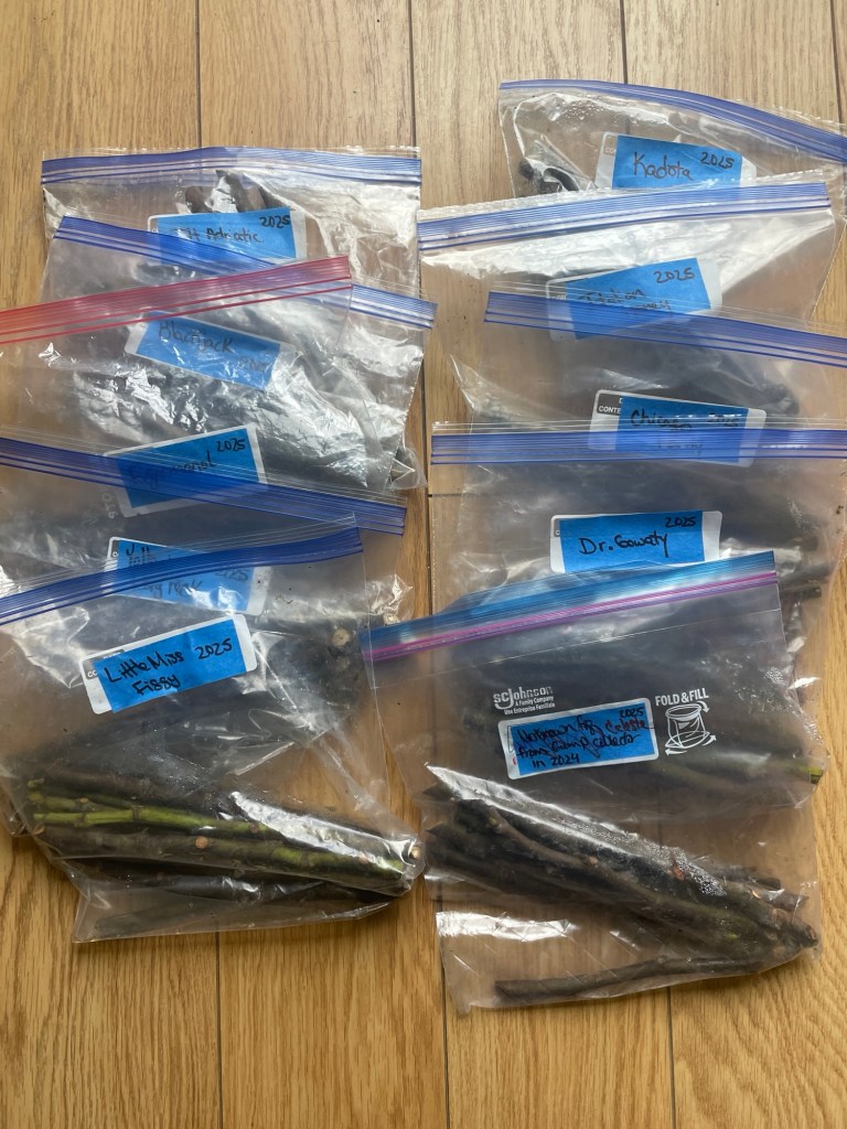 Fig trees are fast growing and highly productive. Grown from cuttings, they usually begin producing reliable and tasty fruit in under 3 years. It’s unlikely that all of my cuttings will root. However, I don’t currently have space prepared for even half of these fruit trees if they successfully root. No worries though. I’ve got time to craft a plan🤠. Anyway, there’s no such thing as having too many beautiful and delicious fruit trees!