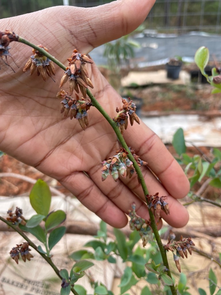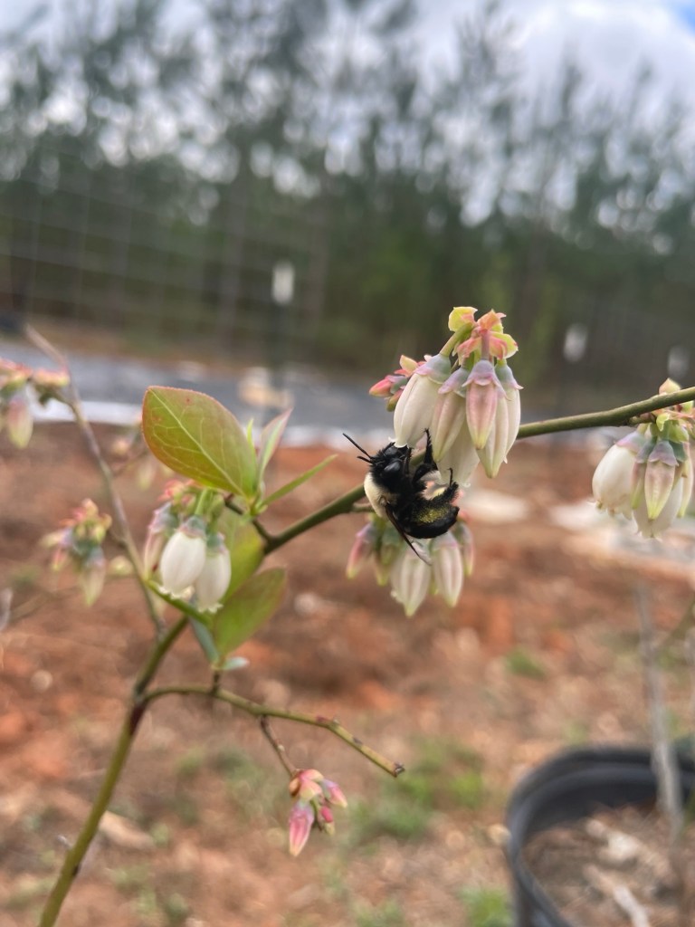 Early season blueberries began setting last month and the native bumble bees have been busy pollinating them. I’ve never seen my honey bees foraging the blueberry flowers, but I can always find the bumble bees buzzing all over the bushes. Thanks to the native bumble bees, I expect to be getting my first harvest of the year very soon – even though the late frost came through and tried to ruin blueberry season.